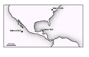 Read-outs from three stations showing arrival of P and S waves and time