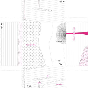 structure, getting bigger with depth. A volcano feeder pipe should be added.