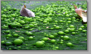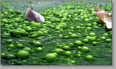 growth of algae (algal blooms). Algae turn the water green, but the problem is that when