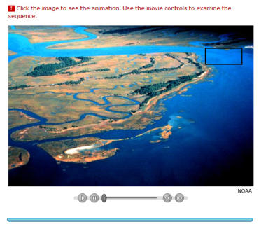 When the velocity of a river decreases a river loses its energy and is unable to carry its load. Material begins to be deposited. Heaviest materials in the load such as large boulders are deposited first. Smaller, lighter materials such as gravel, sand or silt are carried further before they are deposited by the river. Deposition may take place when:•the river’s velocity is reduced after a period of low precipitation•the river enters the sea or a lake•the river overflows its banks and its velocity decreases outside the river channel•there is shallower water on the inside of a river bend.The following animation shows a side view of an area where a river flows into a lake. As the flowing water enters the lake, its velocity decreases and sediment is deposited: